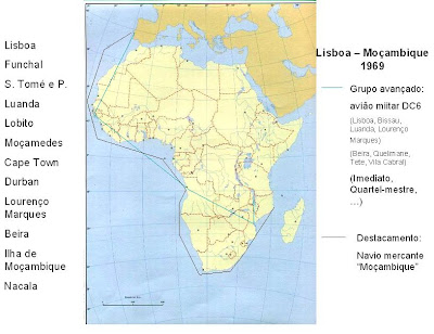 Nota* A viagem em avião teve a seguinte duração: Lisboa-Bissau 8 horas; 2 horas no aeroporto de Bissau antes de descolar para a viagem para Luanda, de 10 horas (24 horas em Luanda, com dormida nas Messes da FAP); mais 7 horas de voo até L. Marques.